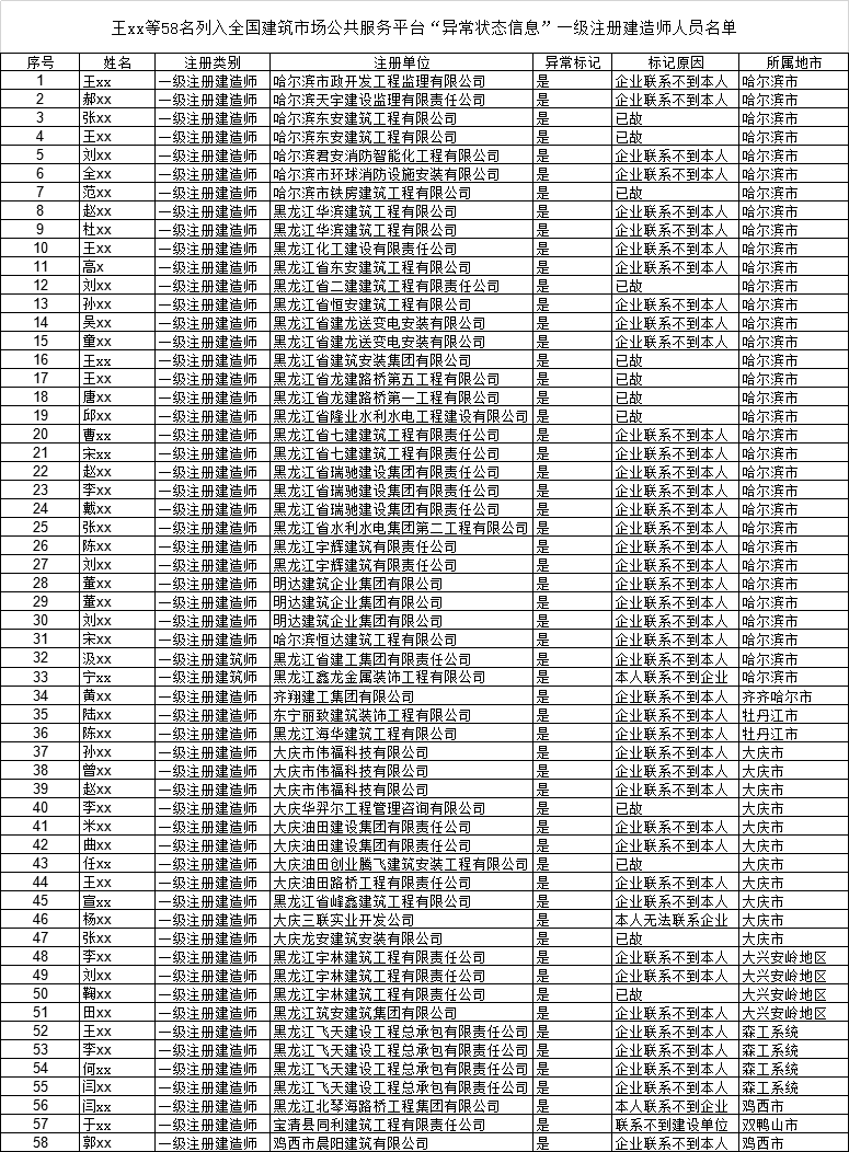 按照《黑龍江省住房和城鄉(xiāng)建設(shè)廳等關(guān)于印發(fā)<工程建設(shè)領(lǐng)域?qū)I(yè)技術(shù)人員職業(yè)資格“掛證”等違法違規(guī)行為專項整治方案>》(黑建建〔2018〕19號)要求,為進(jìn)一步做好“掛證”清理工作,現(xiàn)對王xx等58名列入全國建筑市場公共服務(wù)平臺“異常狀態(tài)信息”一級注冊建造師實施注銷,現(xiàn)予以公示(人員名單詳見附表),公示期為7日(2020年7月31日至2020年8月6日)。 公示期間,對公示內(nèi)容有異議的企業(yè)或個人可持相關(guān)證明材料至省住建廳建筑業(yè)管理處申訴。逾期未申訴的,公示期后,將對有關(guān)人員實施注銷。