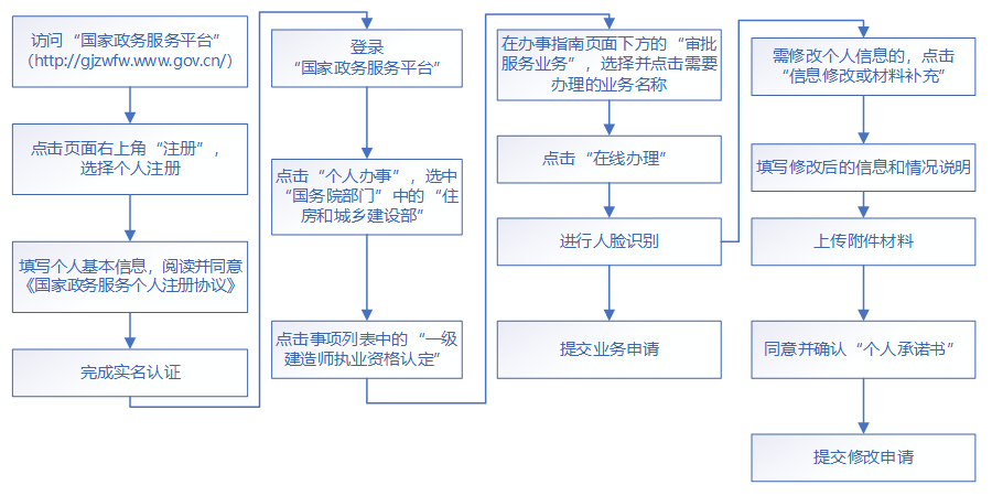 自2020年9月1日起,申請人將統(tǒng)一通過“國家政務(wù)服務(wù)平臺(tái)”申報(bào)一級建造師初始、增項(xiàng)、重新注冊等業(yè)務(wù)。申請人在國家政務(wù)服務(wù)平臺(tái)注冊賬號并完成實(shí)名認(rèn)證后,通過人臉識(shí)別進(jìn)入所選事項(xiàng)辦理頁面。若需修改個(gè)人信息的,通過“個(gè)人信息修改或補(bǔ)充材料”頁面,提出申請。(具體申報(bào)流程見下圖)