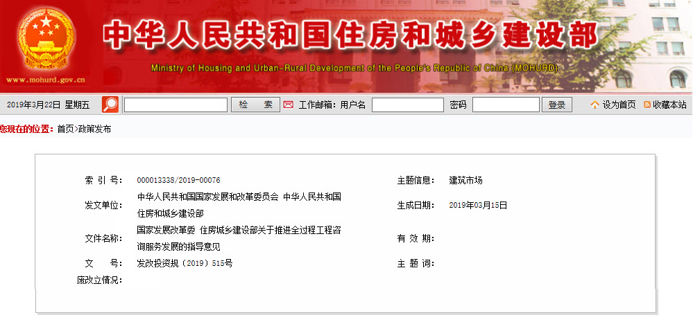 國家發(fā)展改革委、住房城鄉(xiāng)建設部發(fā)布《關于推進全過程工程咨詢服務發(fā)展的指導意見》。