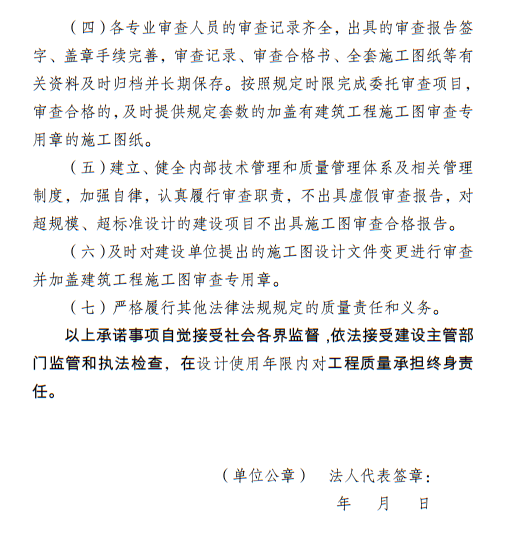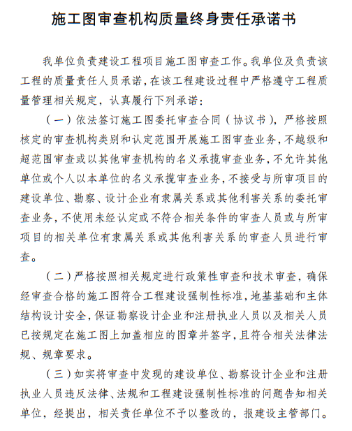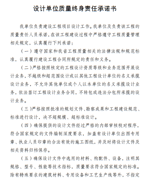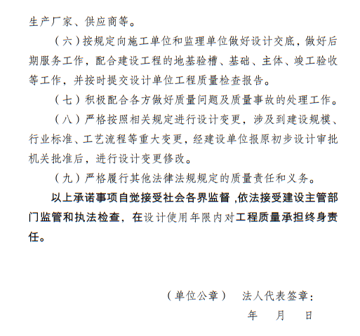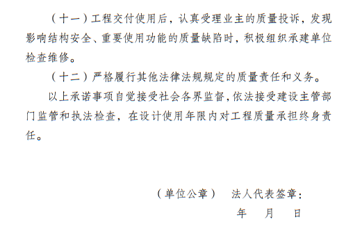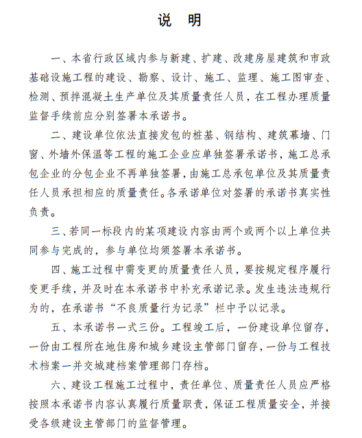(四)《承諾書》一式三份,一份由相關(guān)責(zé)任單位留存,一份由工程所在地住房和城鄉(xiāng)建設(shè)主管部門留存,一份與工程技術(shù)檔案一并交城建檔案管理部門存檔。各承諾單位對(duì)所簽署的《承諾書》真實(shí)性負(fù)責(zé)。