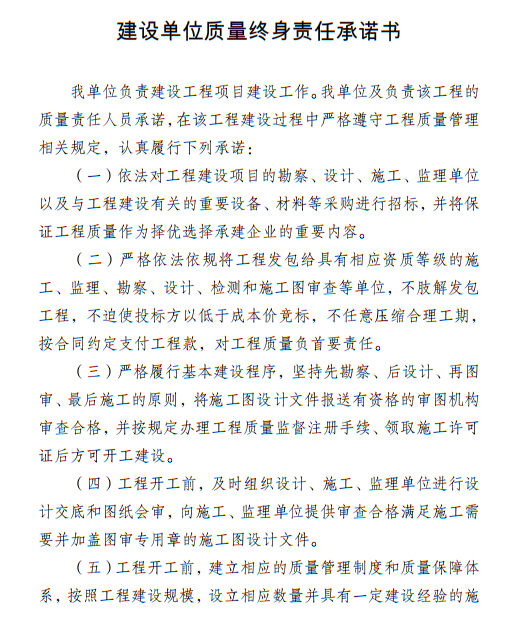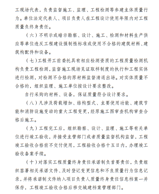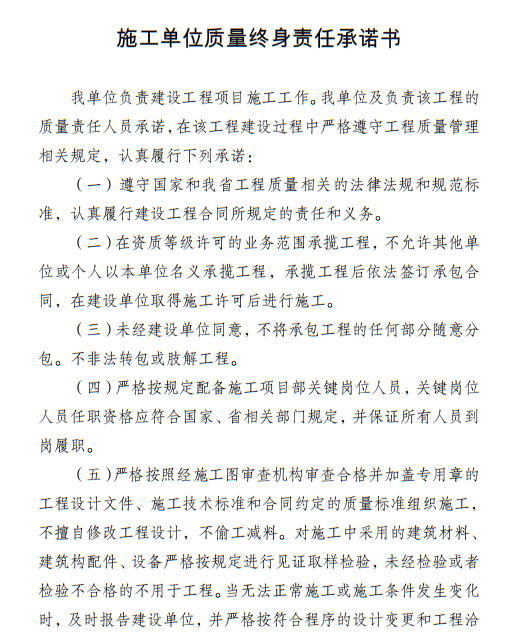 4、建設(shè)期間發(fā)生質(zhì)量事故,或交付使用后在設(shè)計(jì)使用年限期內(nèi)出現(xiàn)質(zhì)量事故和嚴(yán)重質(zhì)量問題的,依法追究責(zé)任單位和質(zhì)量責(zé)任人員的質(zhì)量終身責(zé)任。