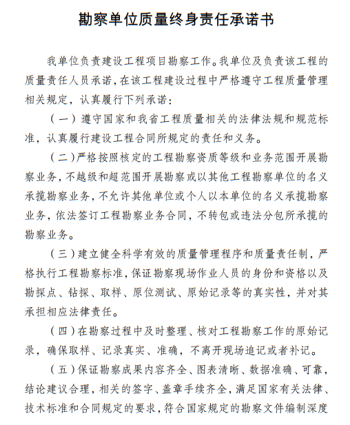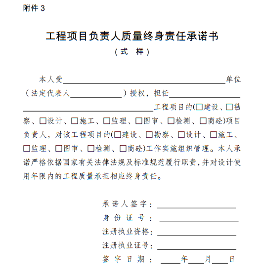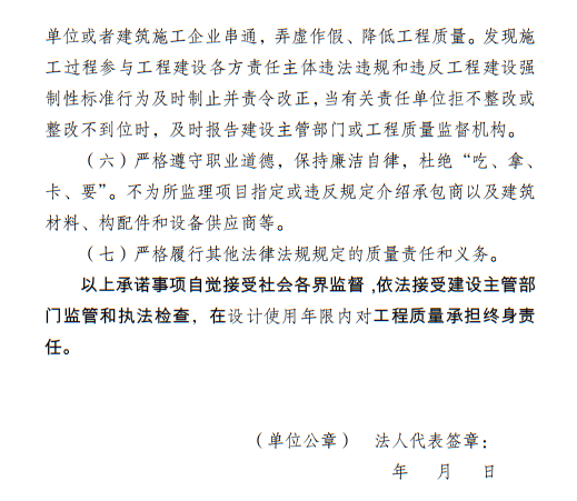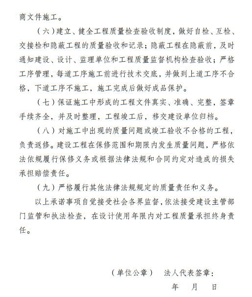 (二)經(jīng)授權(quán)的責(zé)任單位項(xiàng)目負(fù)責(zé)人要簽署《工程項(xiàng)目負(fù)責(zé)人質(zhì)量責(zé)任承諾書》(見附件3),其他質(zhì)量責(zé)任人員在《承諾書》后《單位質(zhì)量責(zé)任人信息登記表》中簽字承諾。