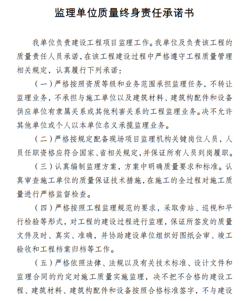 (一)各地要高度重視,嚴(yán)格落實(shí)工程質(zhì)量終身責(zé)任承諾制。在辦理建設(shè)工程質(zhì)量監(jiān)督手續(xù)時(shí),應(yīng)當(dāng)查驗(yàn)《承諾書》《法定代表人授權(quán)書》和《工程項(xiàng)目負(fù)責(zé)人質(zhì)量責(zé)任承諾書》是否按要求簽署。在工程建設(shè)過程中,應(yīng)對(duì)承諾事項(xiàng)落實(shí)情況進(jìn)行督導(dǎo)檢查,確保所有建設(shè)工程的責(zé)任單位、質(zhì)量責(zé)任人員按要求辦理承諾手續(xù),履行承諾責(zé)任。