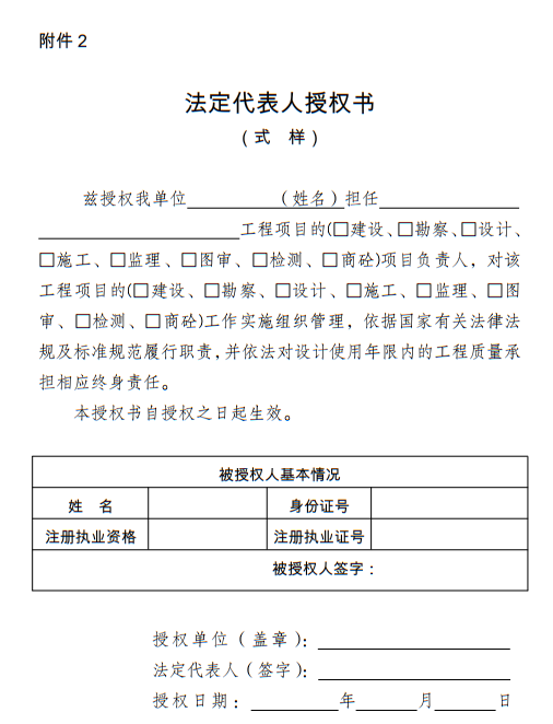 (一)相關(guān)責(zé)任單位在工程開工建設(shè)前要簽署《河北省房屋建筑和市政基礎(chǔ)設(shè)施工程責(zé)任單位質(zhì)量責(zé)任承諾書》(見附件1,以下簡稱《承諾書》),責(zé)任單位法定代表人簽署《法定代表人授權(quán)書》(見附件2),明確該單位該工程的項(xiàng)目負(fù)責(zé)人職責(zé)。