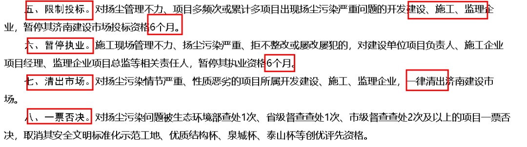 4月3日,濟(jì)南市住建局發(fā)布《關(guān)于強(qiáng)化施工揚(yáng)塵治理措施的通知》(以下簡(jiǎn)稱《通知》),明確將通過源頭把關(guān)、信用懲戒、問題曝光、約談法人、限制投標(biāo)、暫停執(zhí)業(yè)、清出市場(chǎng)、一票否決等八項(xiàng)措施,強(qiáng)化建筑工地?fù)P塵治理,污染嚴(yán)重的項(xiàng)目參建各方將被實(shí)施信用懲戒,相關(guān)單位及個(gè)人也將被暫停投標(biāo)及執(zhí)業(yè)資格6個(gè)月。