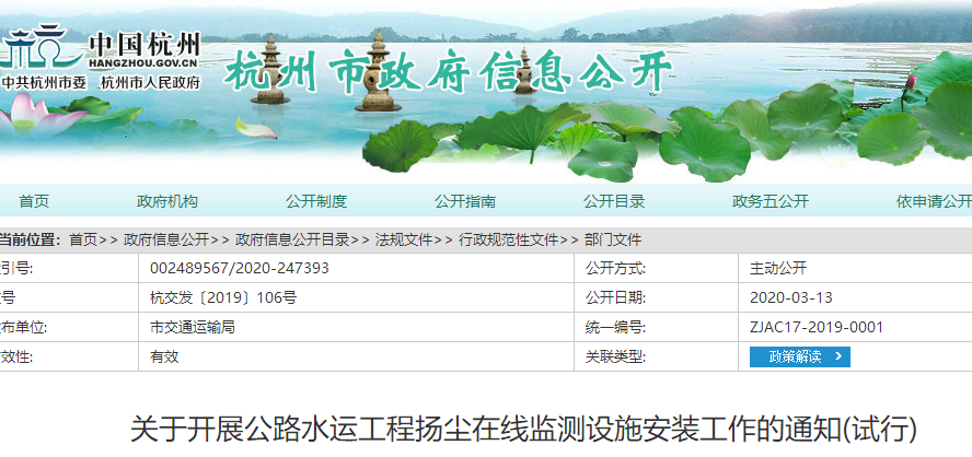 日前,浙江省杭州市《關(guān)于開展公路水運(yùn)工程揚(yáng)塵在線監(jiān)測(cè)設(shè)施安裝工作的通知(試行)》(以下簡(jiǎn)稱《通知》)實(shí)行,旨在進(jìn)一步提升施工現(xiàn)場(chǎng)揚(yáng)塵管控科技水平,找準(zhǔn)污染源頭,形成“源頭嚴(yán)防、過程嚴(yán)管”的污染防治體系。