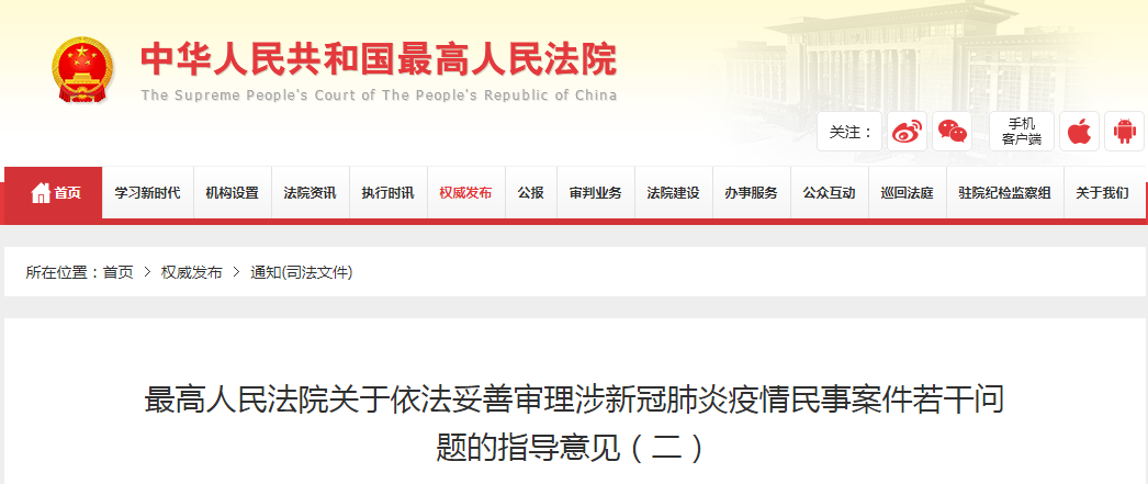 5月19日,最高人民法院發(fā)布《關(guān)于依法妥善審理涉新冠肺炎疫情民事案件若干問題的指導(dǎo)意見(二)》,其中指出: