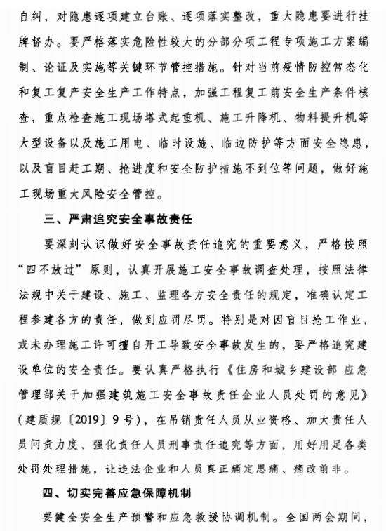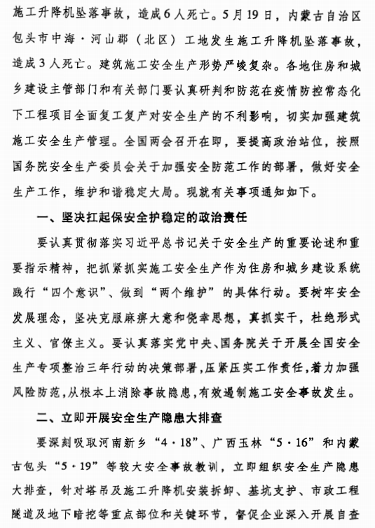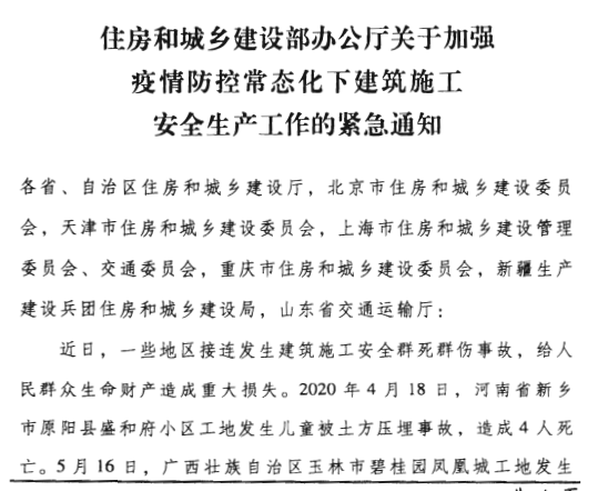 日前,住建部辦公廳下發(fā)《關(guān)于加強(qiáng)疫情防控常態(tài)化建筑施工安全生產(chǎn)工作的緊急通知》。通知指出,為深刻吸取河南新鄉(xiāng)“4·18”四死事故、廣西玉林“5·16”六死事故和內(nèi)蒙古包頭“5·19”三死事故等教訓(xùn),決定立即組織安全生產(chǎn)隱患大排查。1、重點(diǎn)檢查施工現(xiàn)場(chǎng)塔式起重機(jī)、施工升降機(jī)、物料提升機(jī)等大型設(shè)備;