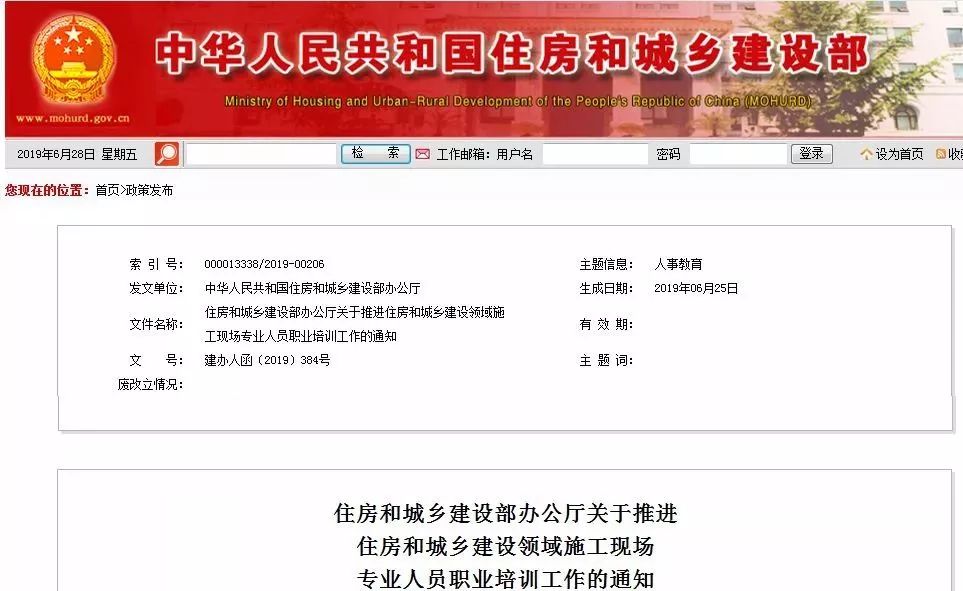 2019年6月28日住建部官網(wǎng)發(fā)布《關(guān)于推進(jìn)住房和城鄉(xiāng)建設(shè)領(lǐng)域施工現(xiàn)場專業(yè)人員職業(yè)培訓(xùn)工作的通知》(建辦人函[2019]384號)。推動新的“八大員”職業(yè)培訓(xùn)工作。