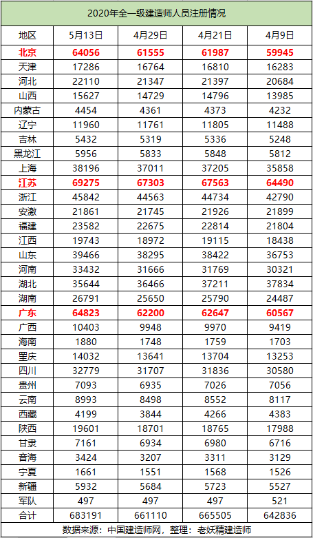 截止到5月13日,全國一級建造師的注冊總量已經接近70萬,達到68.3萬。