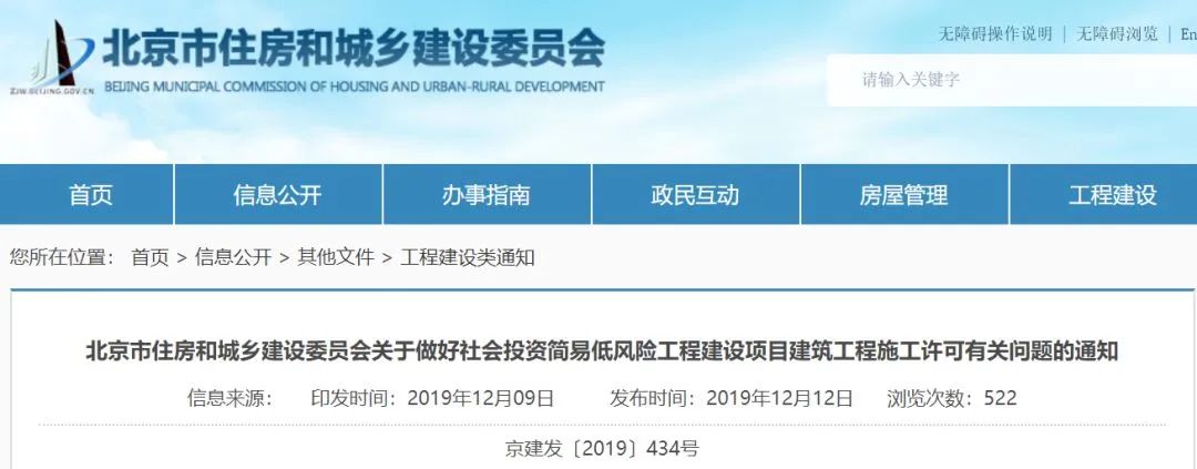 2019年12月9日,北京市住房和城鄉(xiāng)建設(shè)委員會(huì)下發(fā)《關(guān)于做好社會(huì)投資簡(jiǎn)易低風(fēng)險(xiǎn)工程建設(shè)項(xiàng)目建筑工程施工許可有關(guān)問(wèn)題的通知》,明確: