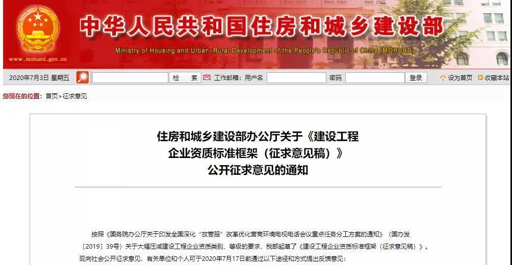 7月2日,住建部發(fā)布《住房和城鄉(xiāng)建設(shè)部辦公廳關(guān)于<建設(shè)工程企業(yè)資質(zhì)標(biāo)準(zhǔn)框架(征求意見稿)>公開征求意見的通知》,在通知中明確: