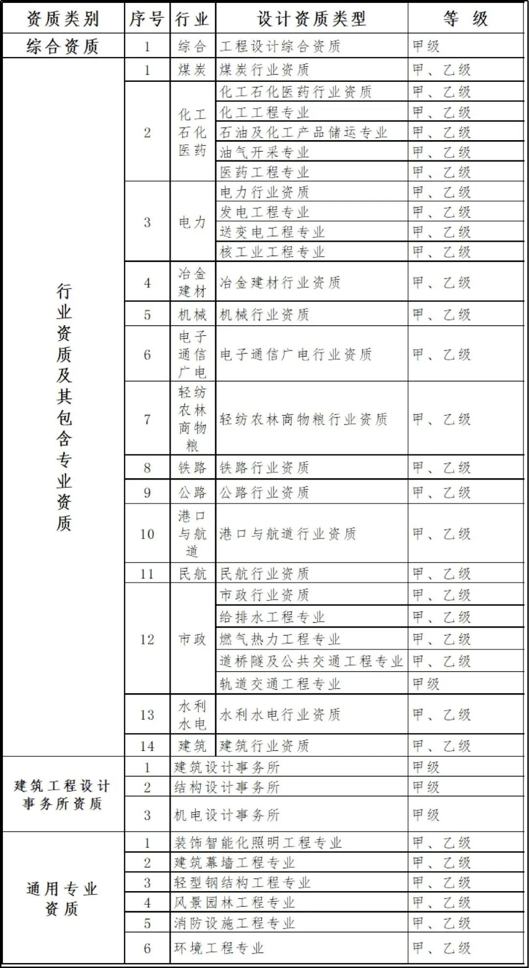 保留綜合資質(zhì)。對部分行業(yè)資質(zhì)進(jìn)行整合,其中,冶金行業(yè)與建材行業(yè)合并為冶金建材行業(yè)資質(zhì),輕紡行業(yè)、農(nóng)林行業(yè)、商物糧行業(yè)合并為輕紡農(nóng)林商物糧行業(yè),電子行業(yè)、通信行業(yè)、廣電行業(yè)合并為電子通信廣電行業(yè),石油天然氣行業(yè)并入化工石化醫(yī)藥行業(yè),軍工行業(yè)并入機(jī)械行業(yè),核工業(yè)行業(yè)并入電力行業(yè),資質(zhì)等級壓減為甲、乙兩級,原丙級資質(zhì)并入相應(yīng)行業(yè)乙級資質(zhì)。取消海洋行業(yè)及專業(yè)資質(zhì),相關(guān)企業(yè)可以換發(fā)相近行業(yè)資質(zhì)。整合原化工石化醫(yī)藥、石油天然氣、電力、市政行業(yè)中的專業(yè)資質(zhì),資質(zhì)等級壓減為甲、乙兩級,原丙級資質(zhì)并入相應(yīng)專業(yè)乙級資質(zhì);取消其他行業(yè)的專業(yè)資質(zhì),并入相應(yīng)行業(yè)資質(zhì),原甲、乙級專業(yè)資質(zhì)并入相應(yīng)等級的行業(yè)資質(zhì),原丙級專業(yè)資質(zhì)并入乙級行業(yè)資質(zhì)。將專項資質(zhì)調(diào)整為通用專業(yè)資質(zhì),取消環(huán)境工程專項資質(zhì)的5個專項類別,整合為環(huán)境工程專業(yè)資質(zhì),資質(zhì)等級壓減為甲、乙兩級,原丙級資質(zhì)并入相應(yīng)專業(yè)乙級資質(zhì)。保留3類事務(wù)所資質(zhì)。