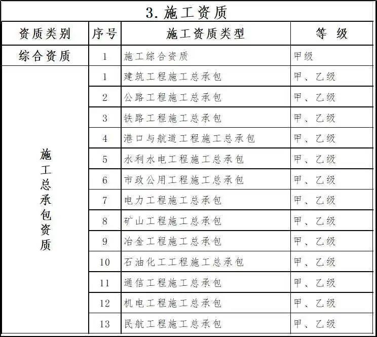 將施工總承包特級資質(zhì)調(diào)整為施工綜合資質(zhì),取得原10類施工總承包特級資質(zhì)中的任一類,即可換發(fā)綜合資質(zhì)。取得綜合資質(zhì)的企業(yè),可承擔(dān)各類別、各等級施工總承包業(yè)務(wù),不再申請或持有其他施工資質(zhì)。