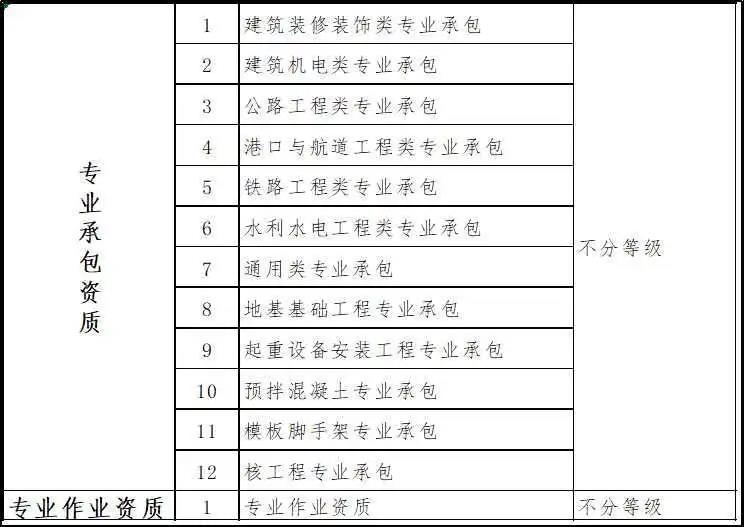 保留地基基礎(chǔ)工程、起重設(shè)備安裝工程、核工程等專業(yè)承包資質(zhì);將原專業(yè)承包資質(zhì)整合為建筑裝修裝飾類、建筑機(jī)電類、公路工程類、港口與航道工程類、鐵路工程類、水利水電工程類、通用類專業(yè)承包資質(zhì);專業(yè)承包資質(zhì)不分等級。