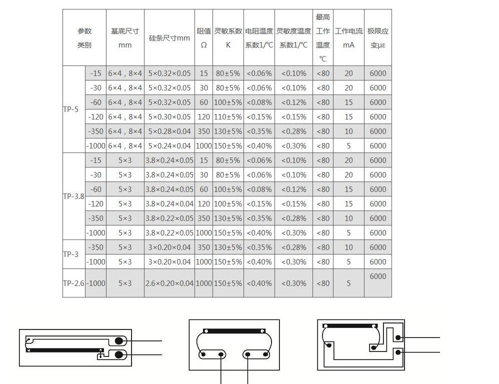 TP系列半導體應變計采用成熟工藝生產,具有靈敏系數大、機械滯后小、阻值范圍寬、橫向效應小等特性。