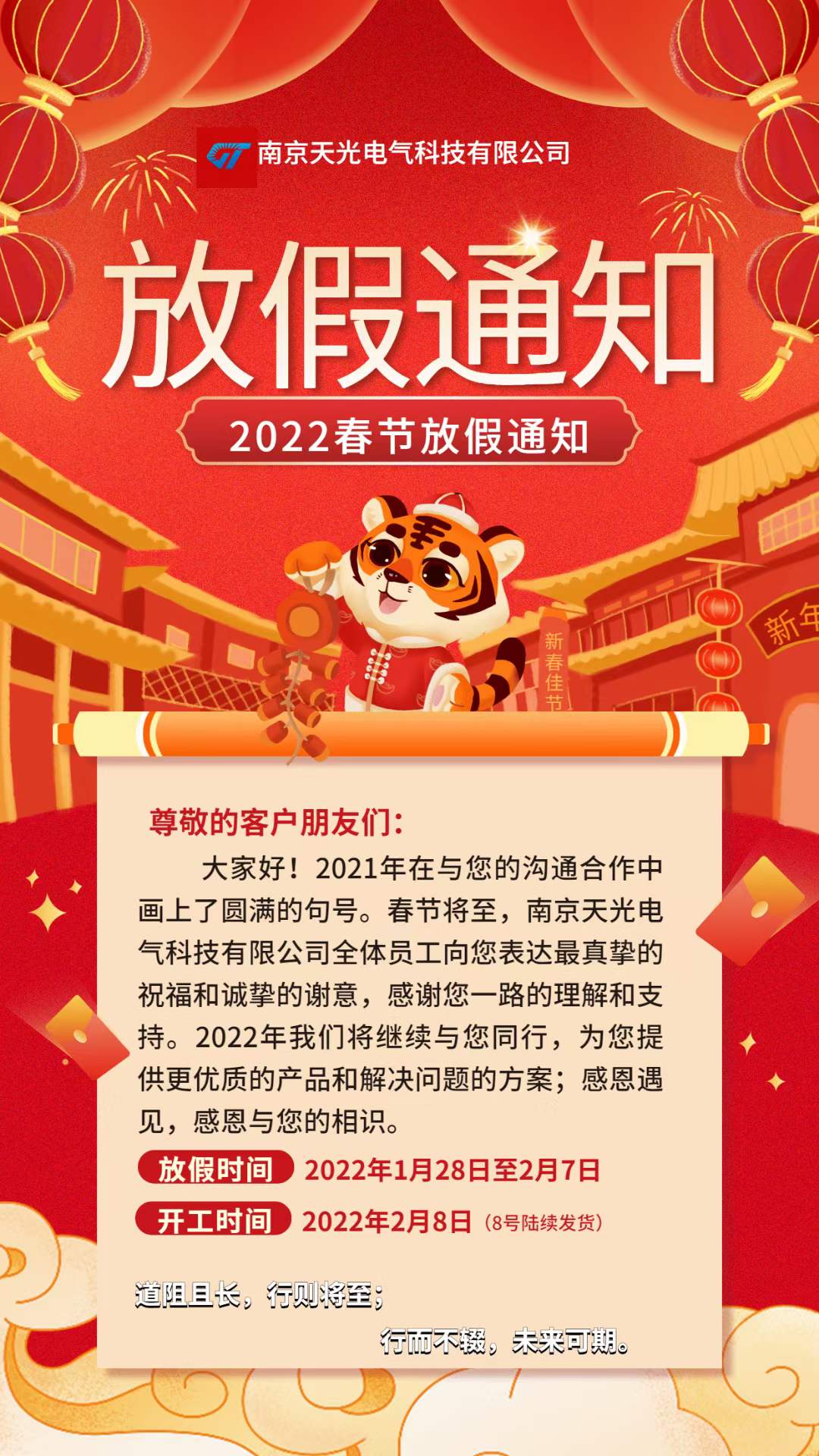 本公司定于2022年1月28日放假,2月8日上班!感謝您一路的幫助和支持,祝您新春愉快,財(cái)源滾滾,生意興隆!