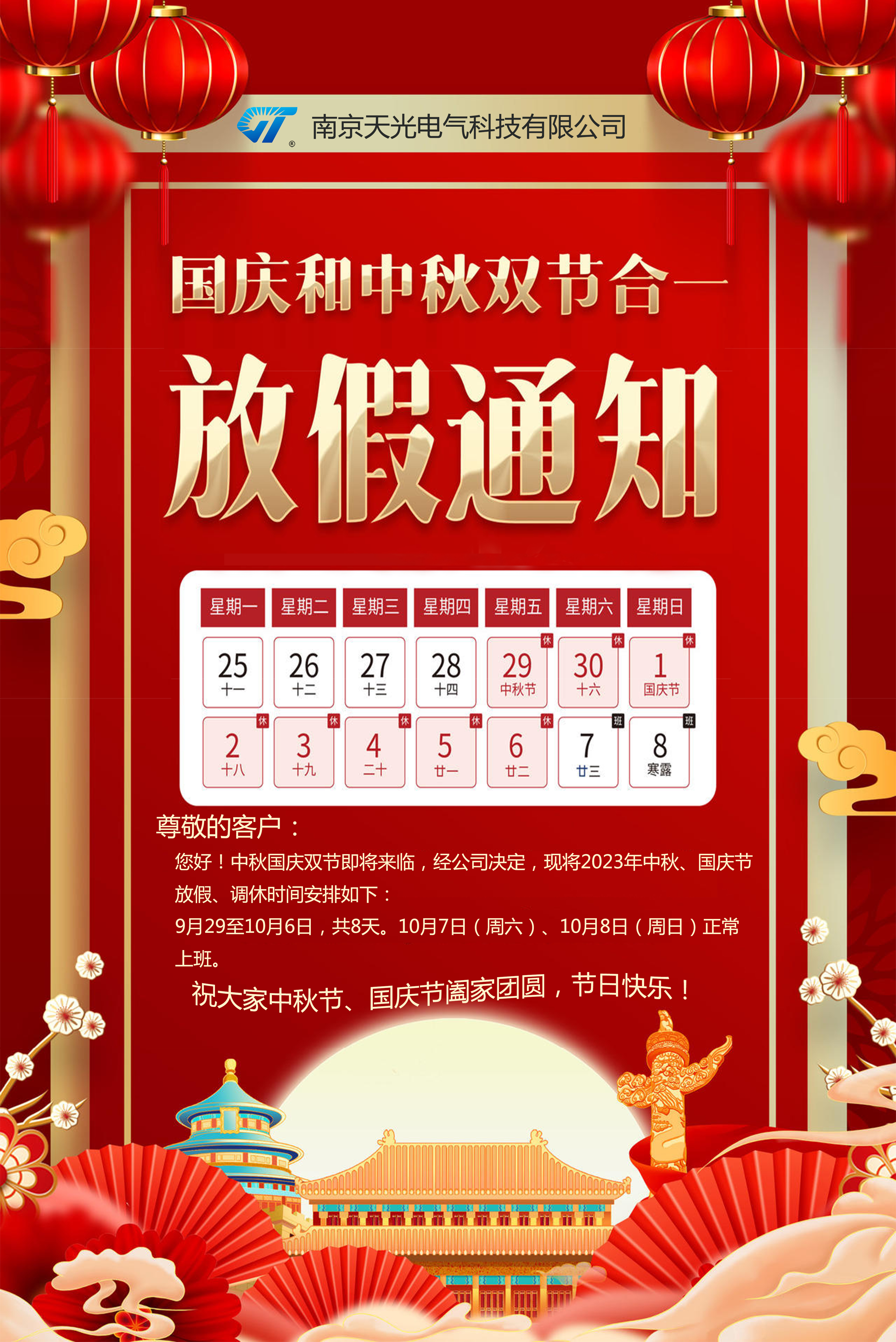尊敬的新老客戶,中秋國慶臨近,我放司?假時間為:2023年9月29日—10月6日,10月7日正上常?班。需要?備貨請?zhí)崆埃崆白Dp節(jié)快樂!闔家幸福!!
