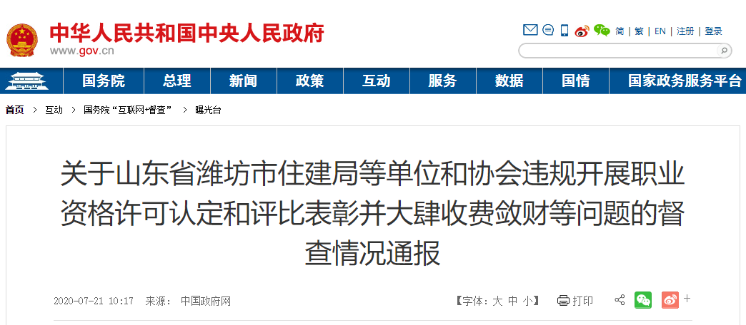 黨中央、國務院高度重視涉企收費治理工作。習近平總書記指出,要減輕企業(yè)負擔,加大對亂收費的查處和整治力度。李克強總理要求,對違規(guī)涉企收費必須堅決清理,不留死角。但是,仍有一些地方和單位對黨中央、國務院三令五申置若罔聞,我行我素,對違規(guī)涉企收費不糾治、不作為,甚至改頭換面,大搞變通。近日,根據(jù)群眾在國務院“互聯(lián)網(wǎng)+督查”平臺反映的問題線索,國辦督查室派員赴山東省濰坊市明察暗訪發(fā)現(xiàn),濰坊市住房和城鄉(xiāng)建設局及其下屬事業(yè)單位采取多種變相手段,安排或默許濰坊市建設工程質(zhì)量安全協(xié)會違規(guī)開展職業(yè)資格認定、違規(guī)開展評比達標表彰、壟斷制發(fā)備案證照并向企業(yè)收費斂財,有關單位和人員大肆揮霍、侵占社團資產(chǎn)?,F(xiàn)將有關情況通報如下: