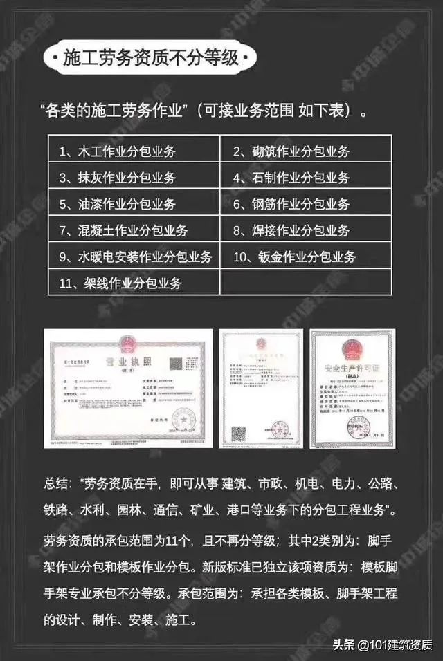 答:施工資質(zhì)分為三個類別:12項總承包資質(zhì)、36項專業(yè)承包資質(zhì)、1項勞務資質(zhì)。每項資質(zhì)設有多個等級。