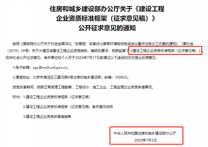 早在今年7月份,住建部就下發(fā)了《建設工程企業(yè)資質(zhì)標準框架(征求意見稿)》。