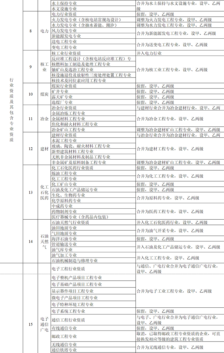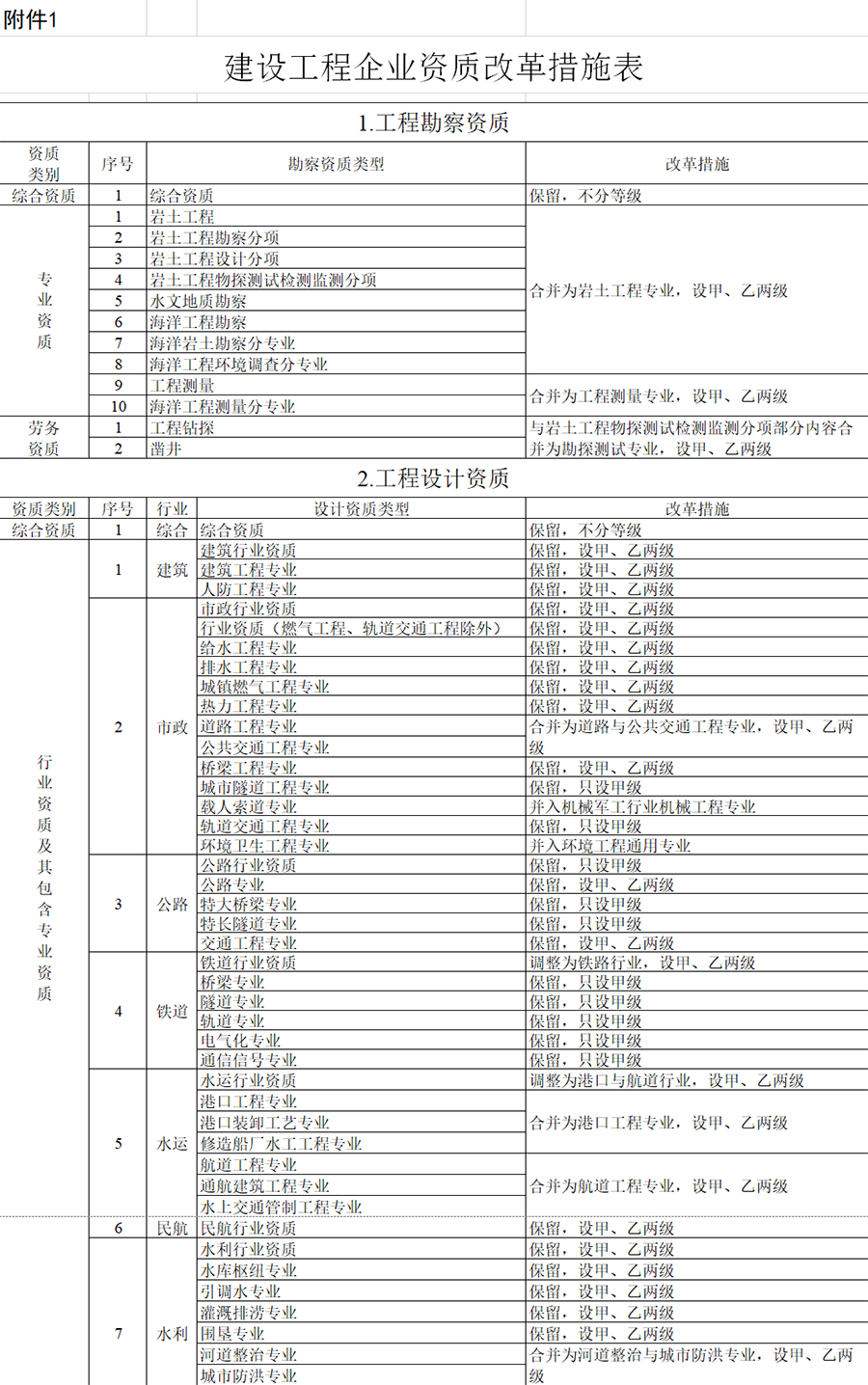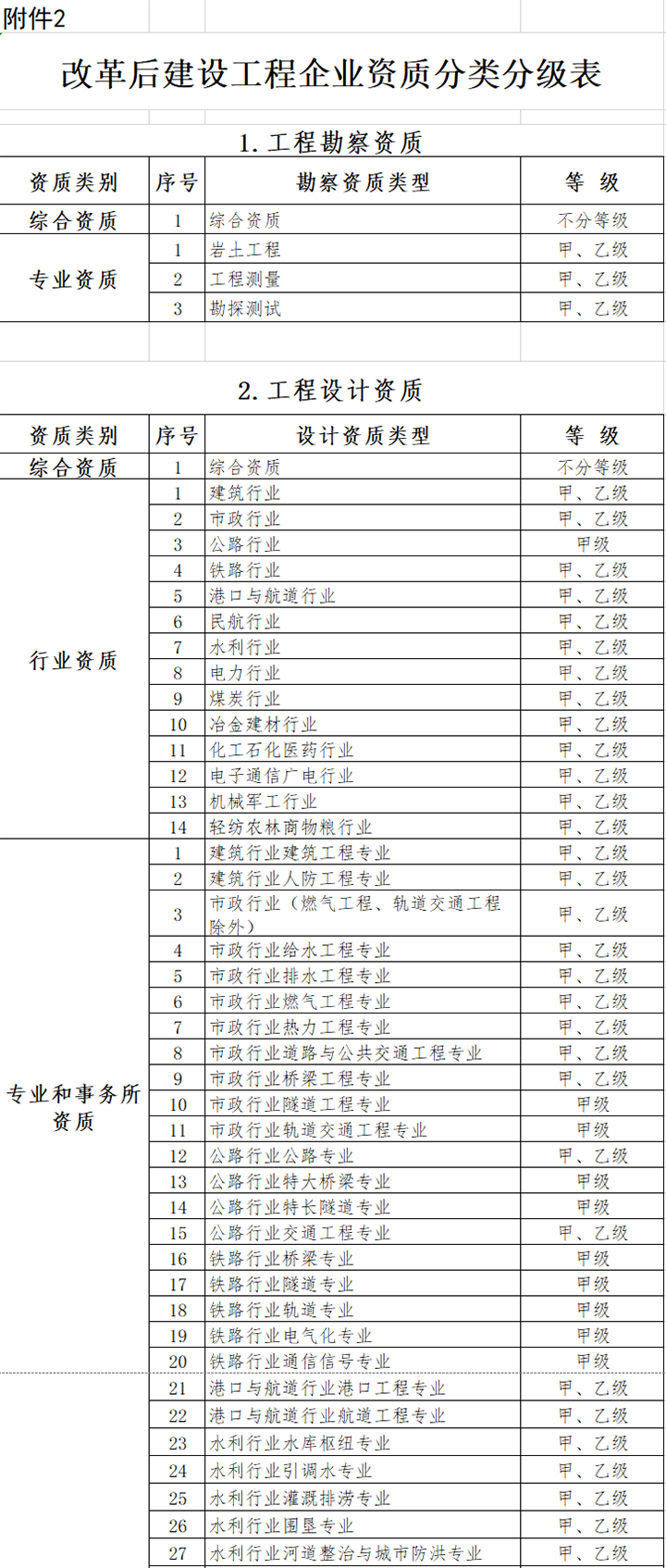 (一)精簡資質(zhì)類別,歸并等級設置。為在疫情防控常態(tài)化條件下做好“六穩(wěn)”工作、落實“六?!比蝿?,進一步優(yōu)化建筑市場營商環(huán)境,確保新舊資質(zhì)平穩(wěn)過渡,保障工程質(zhì)量安全,按照穩(wěn)中求進的原則,積極穩(wěn)妥推進建設工程企業(yè)資質(zhì)管理制度改革。對部分專業(yè)劃分過細、業(yè)務范圍相近、市場需求較小的企業(yè)資質(zhì)類別予以合并,對層級過多的資質(zhì)等級進行歸并。改革后,工程勘察資質(zhì)分為綜合資質(zhì)和專業(yè)資質(zhì),工程設計資質(zhì)分為綜合資質(zhì)、行業(yè)資質(zhì)、專業(yè)和事務所資質(zhì),施工資質(zhì)分為綜合資質(zhì)、施工總承包資質(zhì)、專業(yè)承包資質(zhì)和專業(yè)作業(yè)資質(zhì),工程監(jiān)理資質(zhì)分為綜合資質(zhì)和專業(yè)資質(zhì)。資質(zhì)等級原則上壓減為甲、乙兩級(部分資質(zhì)只設甲級或不分等級),資質(zhì)等級壓減后,中小企業(yè)承攬業(yè)務范圍將進一步放寬,有利于促進中小企業(yè)發(fā)展。具體壓減情況如下: