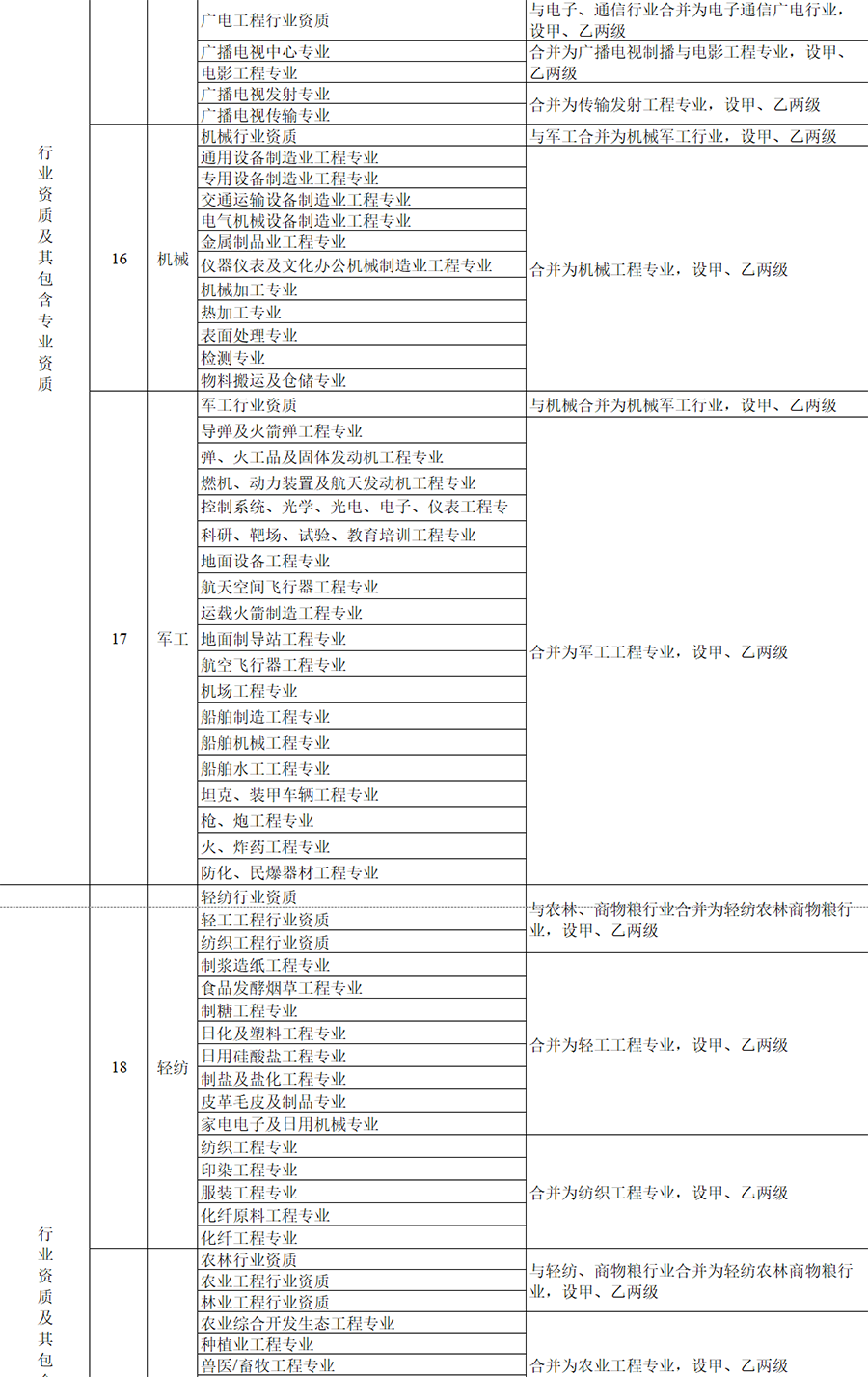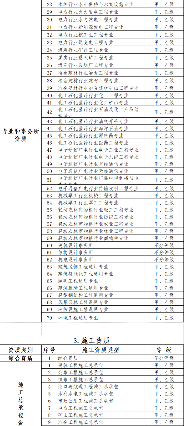2.工程設計資質(zhì)。保留綜合資質(zhì);將21類行業(yè)資質(zhì)整合為14類行業(yè)資質(zhì);將151類專業(yè)資質(zhì)、8類專項資質(zhì)、3類事務所資質(zhì)整合為70類專業(yè)和事務所資質(zhì)。綜合資質(zhì)、事務所資質(zhì)不分等級;行業(yè)資質(zhì)、專業(yè)資質(zhì)等級原則上壓減為甲、乙兩級(部分資質(zhì)只設甲級)。