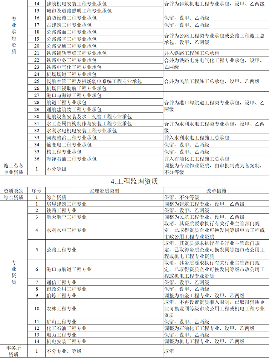4.工程監(jiān)理資質(zhì)。保留綜合資質(zhì);取消專業(yè)資質(zhì)中的水利水電工程、公路工程、港口與航道工程、農(nóng)林工程資質(zhì),保留其余10類專業(yè)資質(zhì);取消事務所資質(zhì)。綜合資質(zhì)不分等級,專業(yè)資質(zhì)等級壓減為甲、乙兩級。