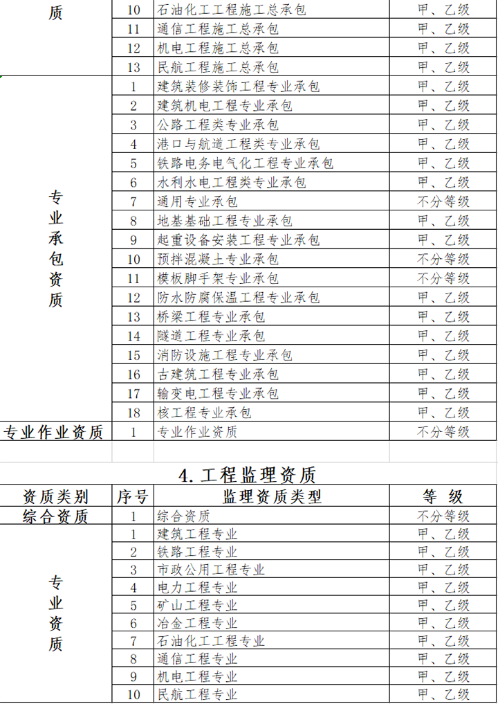 3.施工資質(zhì)。將10類施工總承包企業(yè)特級資質(zhì)調(diào)整為施工綜合資質(zhì),可承擔各行業(yè)、各等級施工總承包業(yè)務;保留12類施工總承包資質(zhì),將民航工程的專業(yè)承包資質(zhì)整合為施工總承包資質(zhì);將36類專業(yè)承包資質(zhì)整合為18類;將施工勞務企業(yè)資質(zhì)改為專業(yè)作業(yè)資質(zhì),由審批制改為備案制。綜合資質(zhì)和專業(yè)作業(yè)資質(zhì)不分等級;施工總承包資質(zhì)、專業(yè)承包資質(zhì)等級原則上壓減為甲、乙兩級(部分專業(yè)承包資質(zhì)不分等級),其中,施工總承包甲級資質(zhì)在本行業(yè)內(nèi)承攬業(yè)務規(guī)模不受限制。