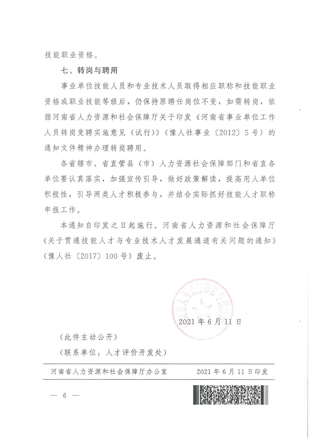 事業(yè)單位技能人員和專業(yè)技術(shù)人員取得相應(yīng)職稱和技能職業(yè)資格或職業(yè)技能等級(jí)后,仍保持原聘任崗位不變,如需轉(zhuǎn)崗,依據(jù)河南省人力資源和社會(huì)保障廳關(guān)于印發(fā)《河南省事業(yè)單位工作人員轉(zhuǎn)崗競(jìng)聘實(shí)施意見(jiàn)(試行)》的通知文件精神辦理轉(zhuǎn)崗聘用。