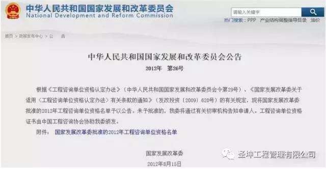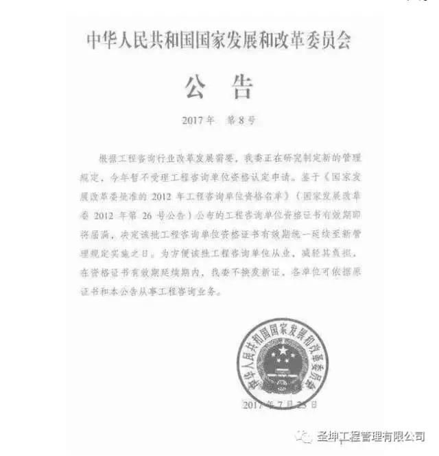 國(guó)家發(fā)展與改革委發(fā)布公告,稱:“我委正在研究制定新的管理規(guī)定,今年暫不受理工程咨詢單位資格認(rèn)定申請(qǐng)。……在資格證書(shū)有效期延續(xù)期內(nèi),我委不換發(fā)新證”。