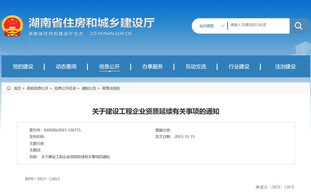 12月15日,湖南省住建廳發(fā)布建設(shè)工程企業(yè)資質(zhì)延續(xù)通知: