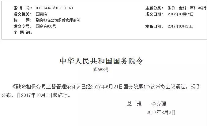 為了規(guī)范融資擔(dān)保公司的行為,防范風(fēng)險(xiǎn),2017年8月2日,國(guó)務(wù)院總理李克強(qiáng)簽署國(guó)務(wù)院令683號(hào),公布《融資擔(dān)保公司監(jiān)督管理?xiàng)l例》(以下簡(jiǎn)稱條例),自2017年10月1日起施行。