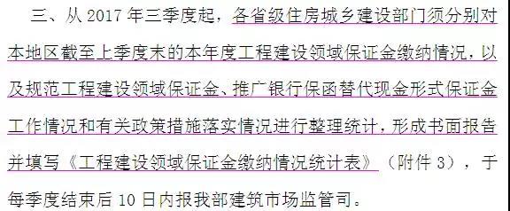 日前住建部發(fā)布建辦市函[2017]460號(hào)文,明確要求各省級(jí)住房城鄉(xiāng)建設(shè)部門須每季度要把推廣銀行保函替代現(xiàn)金形式保證金工作情況和有關(guān)政策措施落實(shí)情況進(jìn)行整理統(tǒng)計(jì),形成書(shū)面報(bào)告,進(jìn)行上報(bào),意思也很明確:各省要加快推廣銀行保函替代現(xiàn)金形式保證金