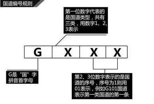 國道:以大寫字母G開頭,字母后三位數(shù)字(與高速區(qū)分)
