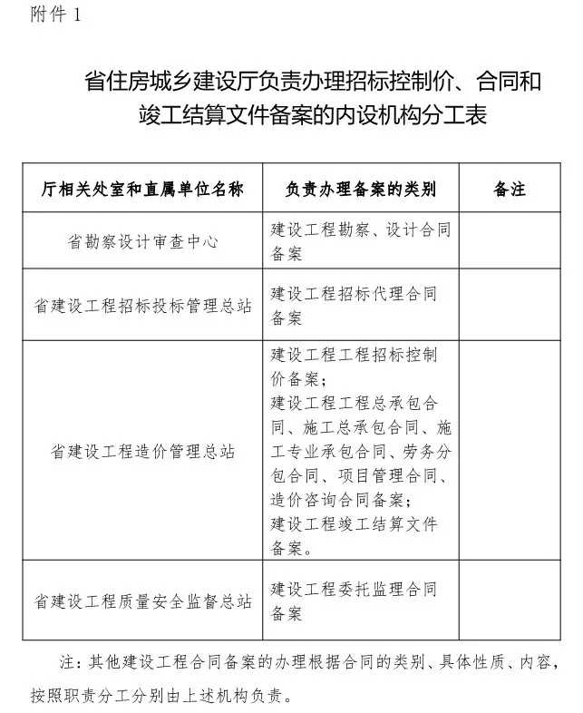 1.省住房城鄉(xiāng)建設(shè)廳負(fù)責(zé)辦理招標(biāo)控制價(jià)、合同和竣工結(jié)算文件備案的內(nèi)設(shè)機(jī)構(gòu)分工表