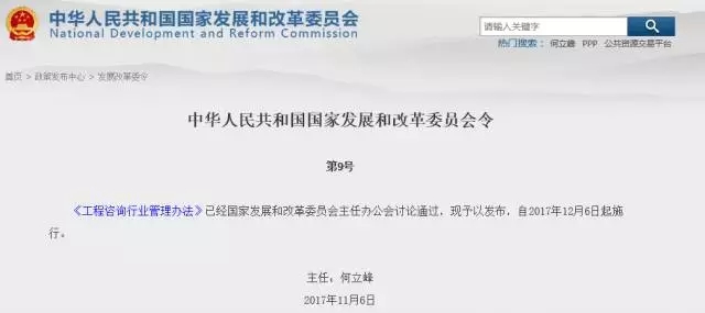 第三十六條 本辦法自 2017 年 12 月 6 日起施行。《工程咨詢單位資格認定辦法》(國家發(fā)展改革委 2005 年第 29 號令)、《國 家發(fā)展改革委關于適用〈工程咨詢單位資格認定辦法〉有關條款 的通知》(發(fā)改投資〔2009〕620 號)、《咨詢工程師(投資)管理辦法》(國家發(fā)展改革委 2013 年第 2 號令)同時廢止。