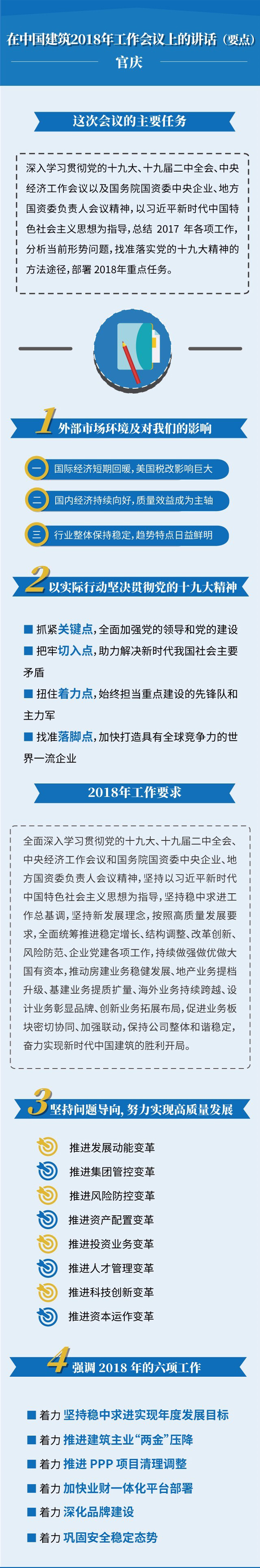 官慶要求,以習(xí)近平新時(shí)代中國特色社會主義經(jīng)濟(jì)思想為指導(dǎo),全面貫徹落實(shí)中央經(jīng)濟(jì)工作會議精神,將培育具有全球競爭力的世界一流企業(yè)作為統(tǒng)領(lǐng)性目標(biāo),傳承紅色基因、永葆忠誠本色、牢記使命擔(dān)當(dāng),堅(jiān)持穩(wěn)中求進(jìn)的工作總基調(diào),堅(jiān)持新發(fā)展理念,按照高質(zhì)量發(fā)展要求,全面統(tǒng)籌穩(wěn)定增長、結(jié)構(gòu)調(diào)整、改革創(chuàng)新、風(fēng)險(xiǎn)防范、企業(yè)黨建各項(xiàng)工作,持續(xù)做強(qiáng)做優(yōu)做大國有資本,推動房建業(yè)務(wù)穩(wěn)健發(fā)展、地產(chǎn)業(yè)務(wù)提檔升級、基建業(yè)務(wù)提質(zhì)擴(kuò)量、海外業(yè)務(wù)持續(xù)跨越、設(shè)計(jì)業(yè)務(wù)彰顯品牌、創(chuàng)新業(yè)務(wù)拓展布局,促進(jìn)業(yè)務(wù)板塊密切協(xié)同、加強(qiáng)聯(lián)動,保持公司整體和諧穩(wěn)定,奮力開創(chuàng)新時(shí)代中國建筑的勝利開局。