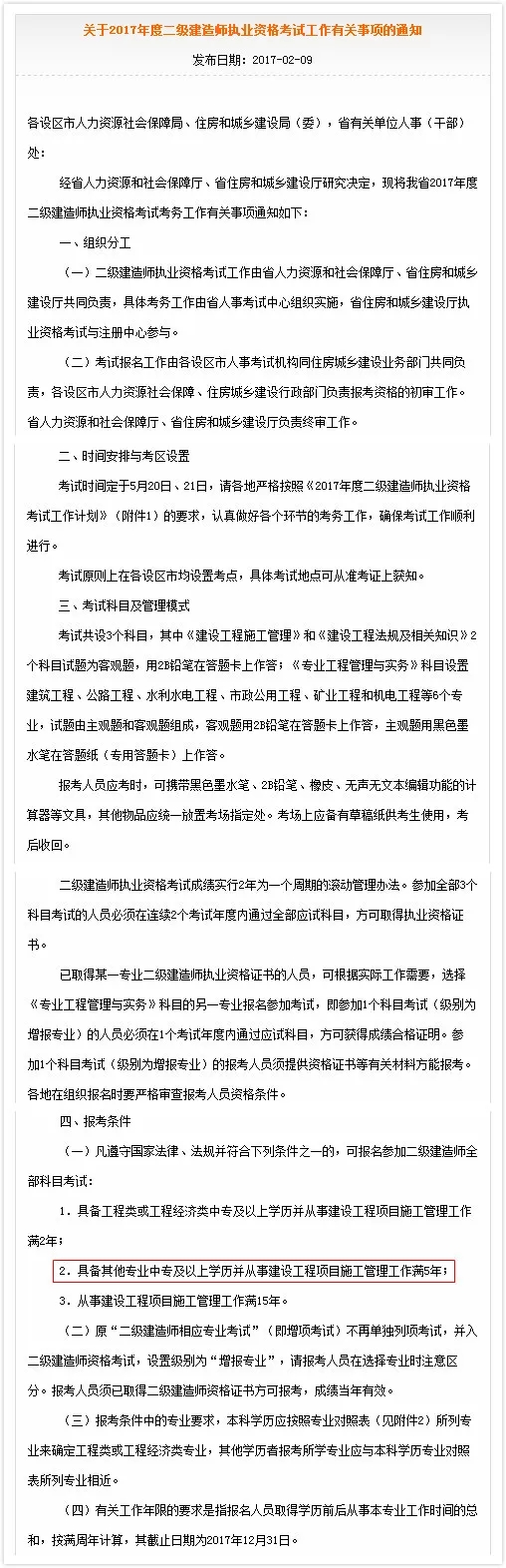 有許多不是工程專業(yè)或工程相關(guān)專業(yè)的朋友們也想報考二級建造師,如果按之前的規(guī)定可能無法報考。但在2017年,安徽,江蘇,陜西三個省份已經(jīng)放寬了報考條件。非本專業(yè)考生,滿足一定工作年限要求也可以報考二級建造師。
