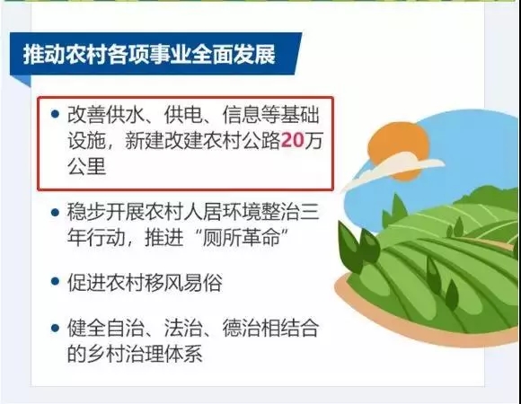2018年還將推動農(nóng)村各項(xiàng)事業(yè)全面發(fā)展。改善供水、供電、信息等基礎(chǔ)設(shè)施,新建改建農(nóng)村公路20萬公里。穩(wěn)步開展農(nóng)村人居環(huán)境整治三年行動,推進(jìn)“廁所革命”。