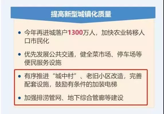 提高新型城鎮(zhèn)化質(zhì)量。有序推進(jìn)“城中村”、老舊小區(qū)改造,完善配套設(shè)施,鼓勵有條件的加裝電梯。加強(qiáng)排澇管網(wǎng)、地下綜合管廊等建設(shè)。