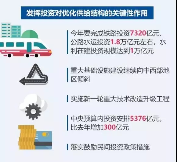 總理強(qiáng)調(diào),今年要完成鐵路投資7320億元、公路水運(yùn)投資1.8萬億元左右,水利在建投資規(guī)模達(dá)到1萬億元。重大基礎(chǔ)設(shè)施建設(shè)繼續(xù)向中西部地區(qū)傾斜。實(shí)施新一輪重大技術(shù)改造升級工程。中央預(yù)算內(nèi)投資安排5376億元,比去年增加300億元。