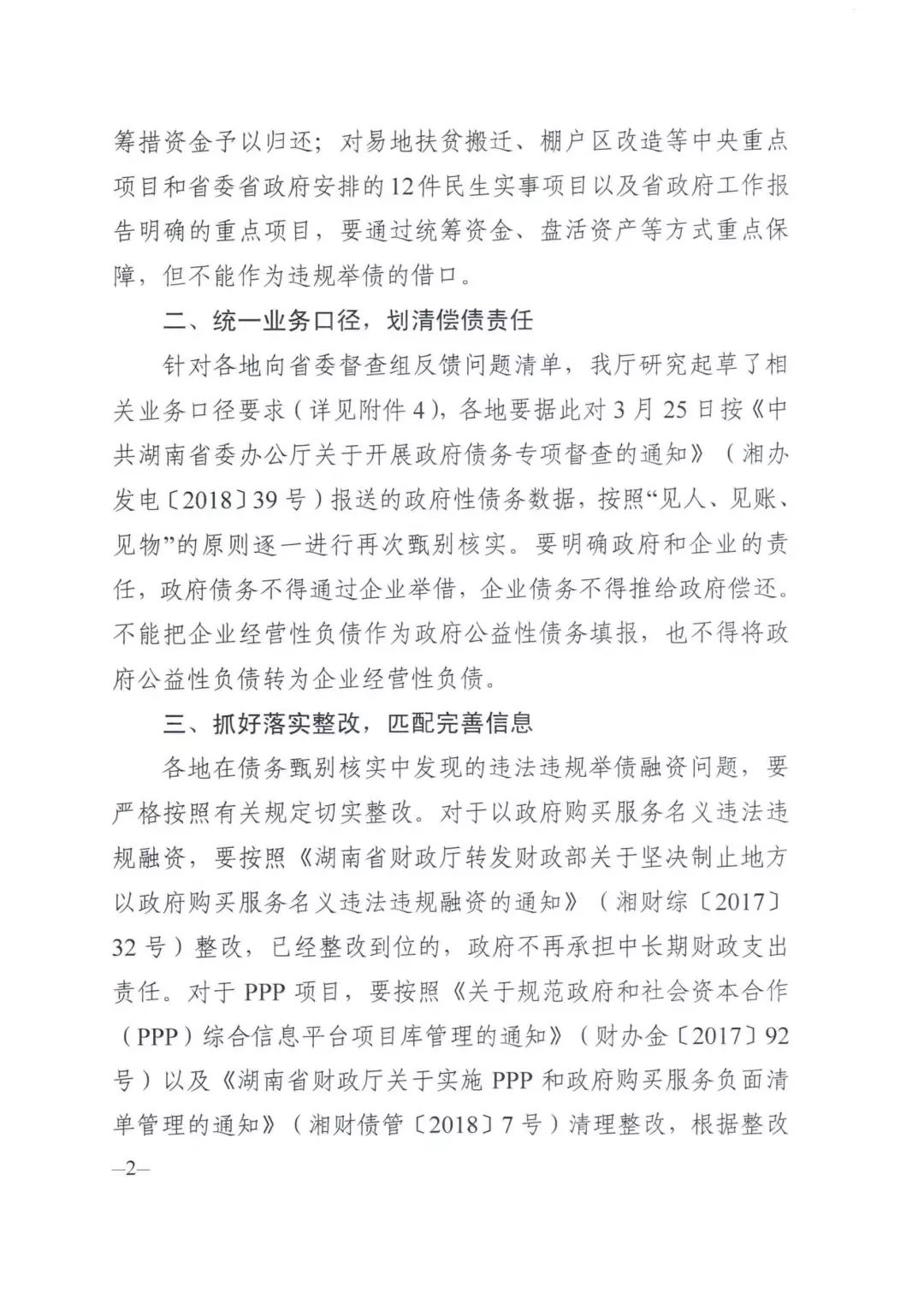 各地在債務(wù)甄別核實中發(fā)現(xiàn)的違法違規(guī)舉債融資問題,要嚴格按照有關(guān)規(guī)定切實整改。對于以政府購買服務(wù)名義違法違規(guī)融資,要按照《湖南省財政廳轉(zhuǎn)發(fā)財政部關(guān)于堅決制止地方以政府購買服務(wù)名義違法違規(guī)融資的通知》(湘財綜[2017]32號)整改,已經(jīng)整改到位的,政府不再承擔中長期財政支出責任。對于PPP項目,要按照財辦金[2017]92號文以及《湖南省財政廳關(guān)于實施PPP和政府購買服務(wù)負面清單管理的通知》(湘財債管[2018]7號)清理整改,根據(jù)整改情況相應(yīng)調(diào)整中長期財政支出責任。