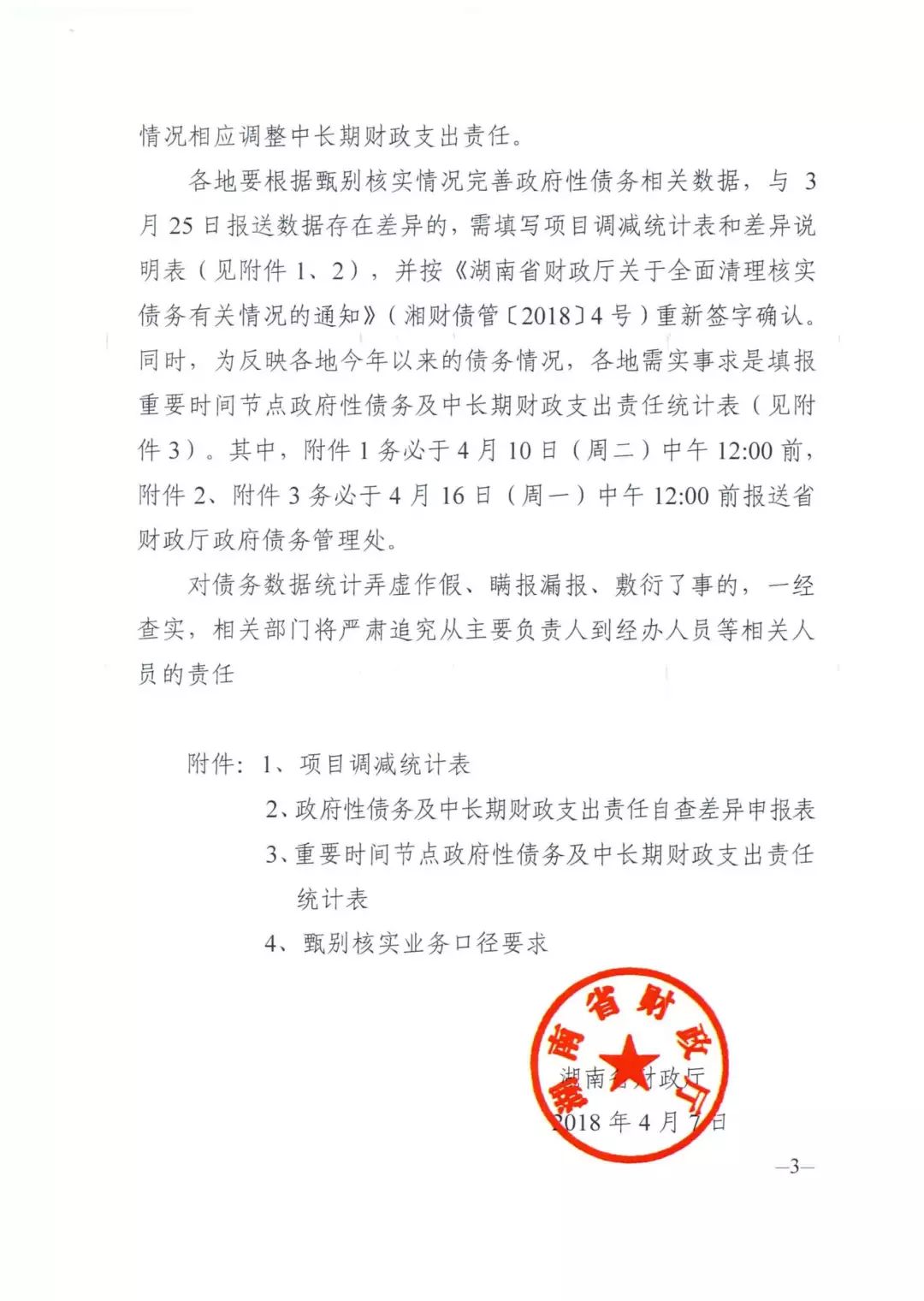 各地要根據(jù)甄別核實情況完善政府性債務(wù)相關(guān)數(shù)據(jù),于3月25日報送數(shù)據(jù)存在差異的,需填寫項目調(diào)減統(tǒng)計表和差異說明表(見附件1、2),并按《湖南省財政廳關(guān)于全面清理核實債務(wù)有關(guān)情況的通知》(湘財債管[2018]4號)重新簽字確認。同時,為反映各地今年以來的債務(wù)情況,各地需實事求是填報重要時間節(jié)點政府性債務(wù)及中長期財政支出責任統(tǒng)計表(見附件3)。其中,附件1務(wù)必于4月10日中午12:00前,附件2、附件3務(wù)必于4月16日中午12:00前報送省財政廳政府債務(wù)管理處。