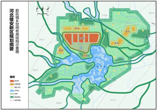 “一主”即起步區(qū),選擇容城、安新兩縣交界區(qū)域作為起步區(qū),是新區(qū)的主城區(qū),按組團(tuán)式布局,先行啟動(dòng)建設(shè)?!拔遢o”即雄縣、容城、安新縣城及寨里、昝崗五個(gè)外圍組團(tuán),全面提質(zhì)擴(kuò)容雄縣、容城兩個(gè)縣城,優(yōu)化調(diào)整安新縣城,建設(shè)寨里、昝崗兩個(gè)組團(tuán),與起步區(qū)之間建設(shè)生態(tài)隔離帶?!岸喙?jié)點(diǎn)”即若干特色小城鎮(zhèn)和美麗鄉(xiāng)村,實(shí)行分類特色發(fā)展,劃定特色小城鎮(zhèn)開發(fā)邊界,嚴(yán)禁大規(guī)模開發(fā)房地產(chǎn)。