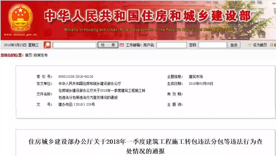 住房城鄉(xiāng)建設(shè)部辦公廳關(guān)于2018年一季度建筑工程施工轉(zhuǎn)包違法分包等違法行為查處情況的通報