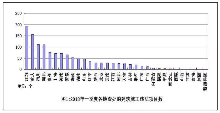 從各地查處的違法工程項目數(shù)量看,江蘇、重慶、四川、湖北4?。ㄊ校┎樘幜Χ容^大,分別查處項目194個、156個、112個、110個(見圖1)。