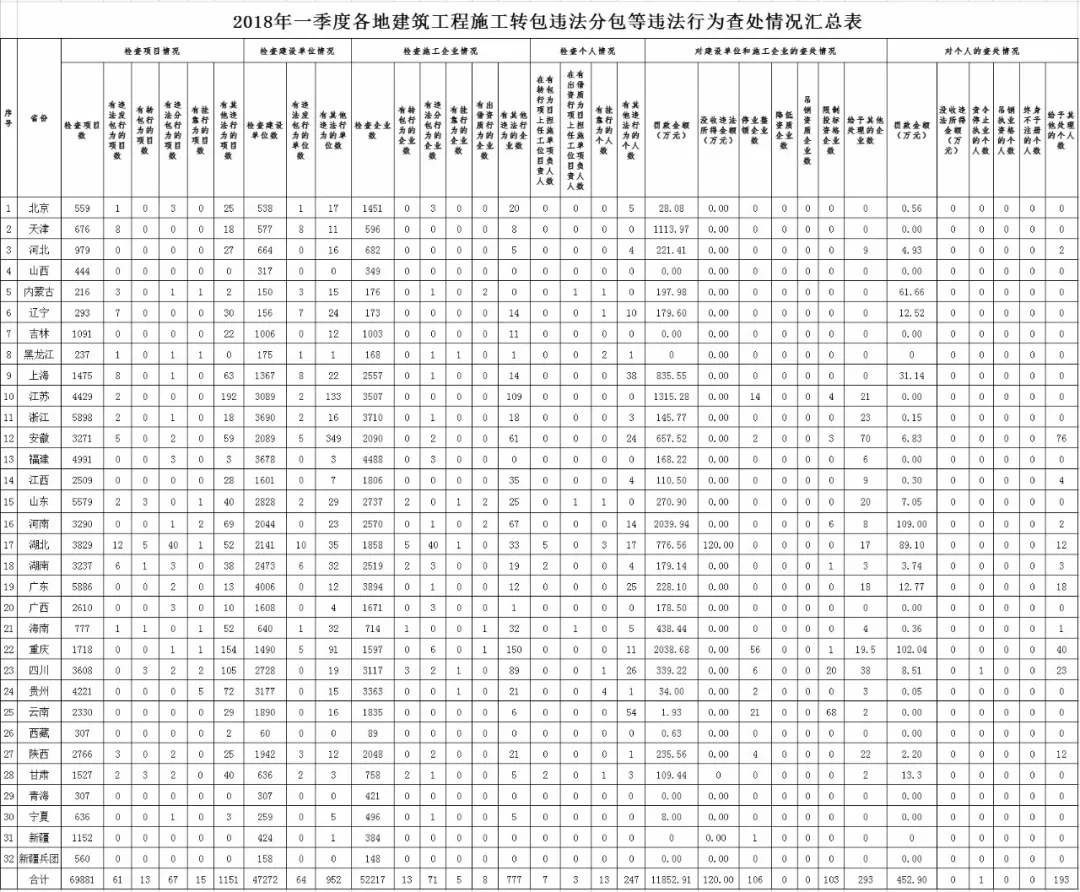 附件:2018年一季度各地建筑工程施工轉(zhuǎn)包違法分包等違法行為查處情況匯總表(見下圖)