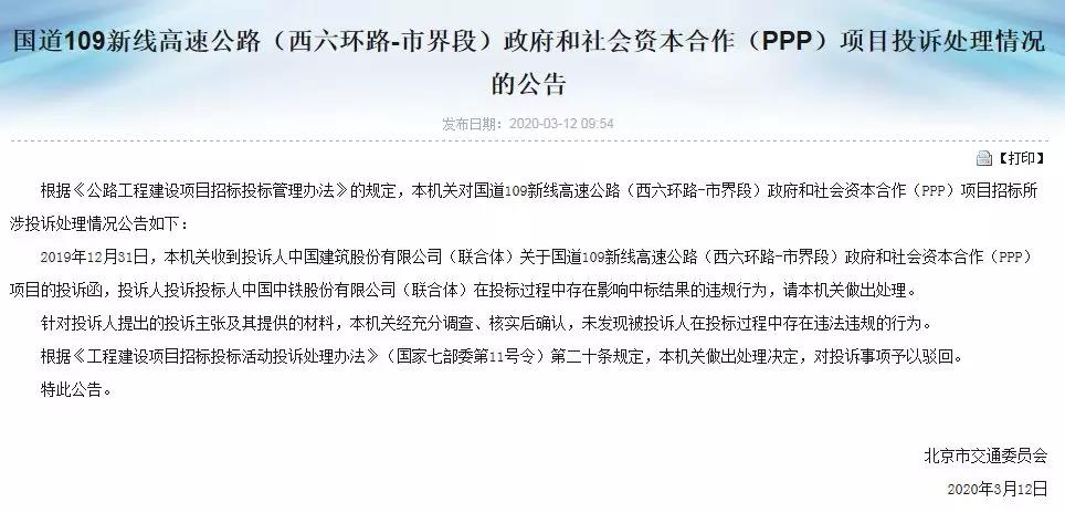 通告顯示,2019年12月31日本機(jī)關(guān)收到投訴人中國(guó)建筑股份有限公司(聯(lián)合體)關(guān)于國(guó)道109新線高速公路(西六環(huán)路-市界段)政府和社會(huì)資本合作(PPP)項(xiàng)目的投訴函,投訴人投訴投標(biāo)人中國(guó)中鐵股份有限公司(聯(lián)合體)在投標(biāo)過程中存在影響中標(biāo)結(jié)果的違規(guī)行為,請(qǐng)本機(jī)關(guān)做出處理。