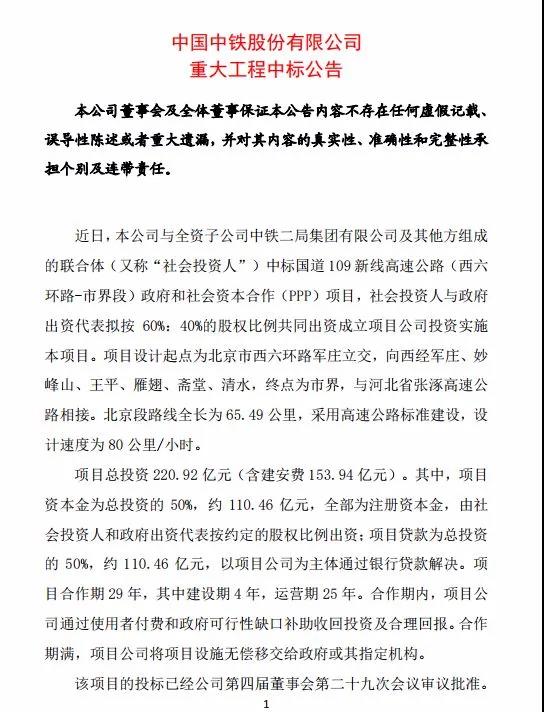 近日,公司與全資子公司中鐵二局集團(tuán)及其他方組成的聯(lián)合體,中標(biāo)國(guó)道109新線高速公路(西六環(huán)路-市界段)政府和社會(huì)資本合作(PPP)項(xiàng)目,社會(huì)投資人與政府出資代表擬按60%:40%的股權(quán)比例共同出資成立項(xiàng)目公司投資實(shí)施該項(xiàng)目。項(xiàng)目總投資220.92億元(含建安費(fèi)153.94億元)。
